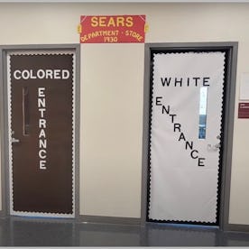 The “white” and “colored” door entrances were created for a lesson on segregation.