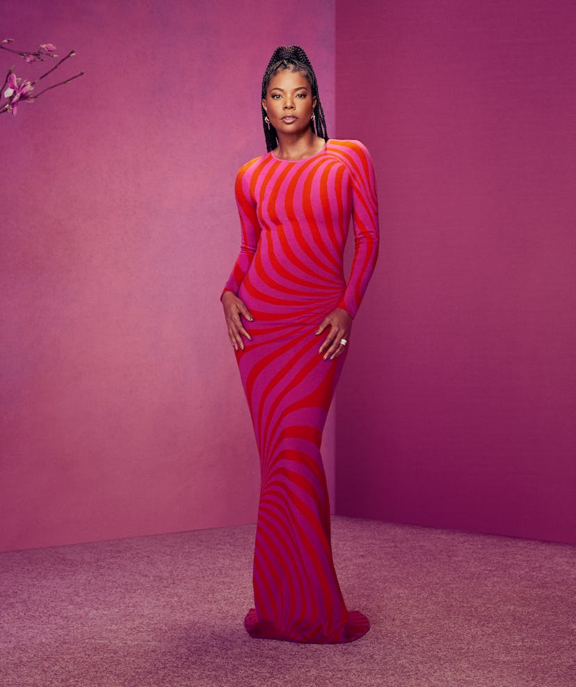 Brandon Maxwell dress, Jennifer Fisher earrings, Talent’s own rings