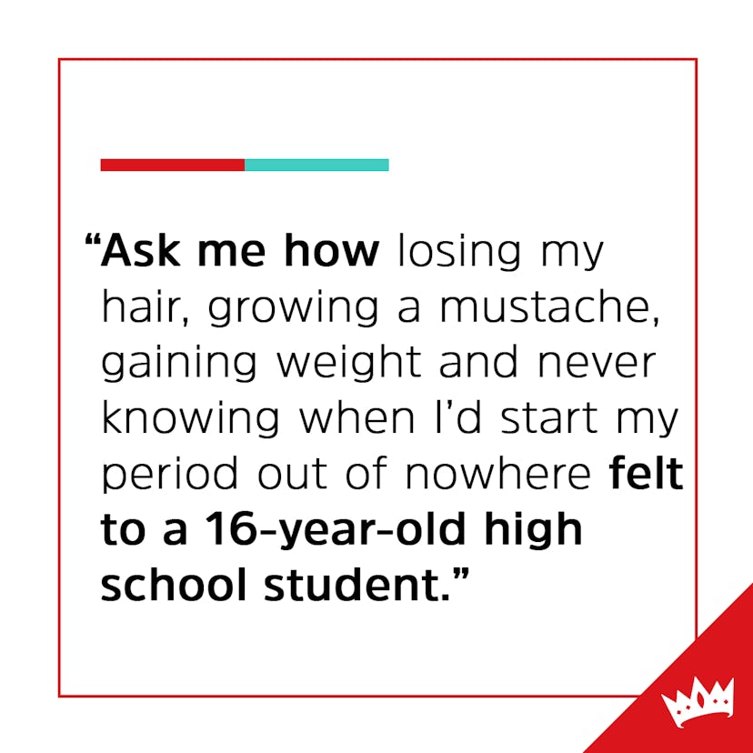 Ask me how losing my hair, growing a mustache, gaining weight and never knowing when I’d start my period out of nowhere felt to a 16-year-old high school student.