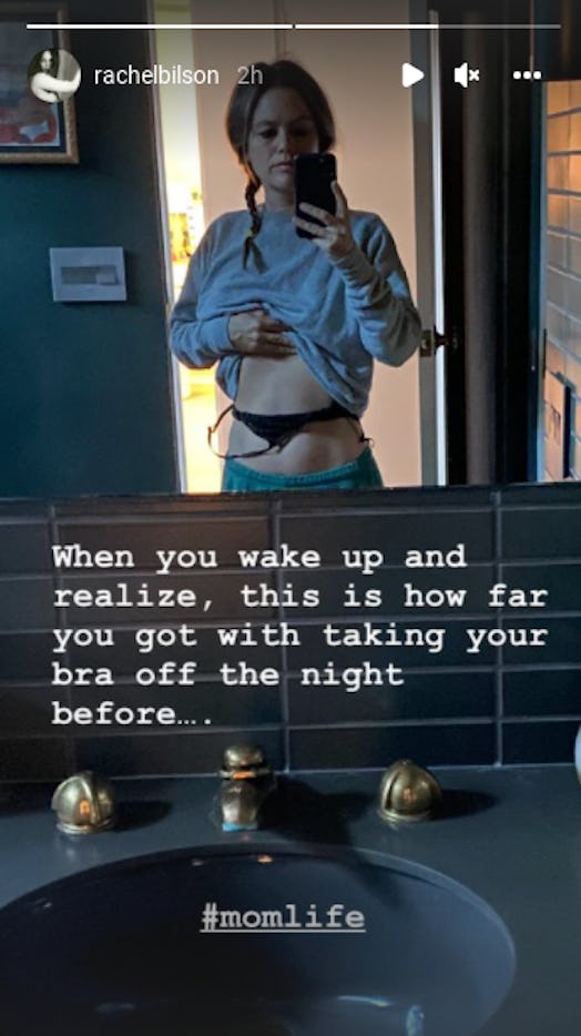 “When you wake up and realize, this is how far you got with taking your bra off the night before,” Bilson captioned the Instagram story photo, adding, “#momlife.”