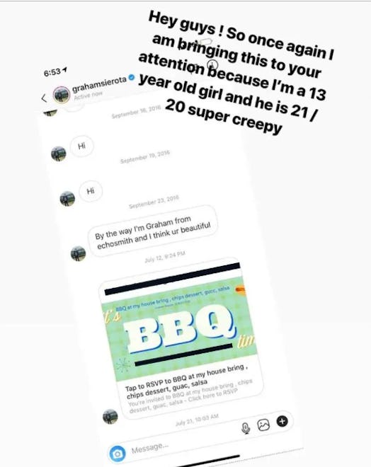 Alabama, rightly fed up with having to fend off the advances of a very legal adult, shared screenshots of the messages to her Instagram story, writing, “Hey guys! So once again I am bringing this to your attention because I’m a 13 year old girl and he is 21/20 super creepy.”